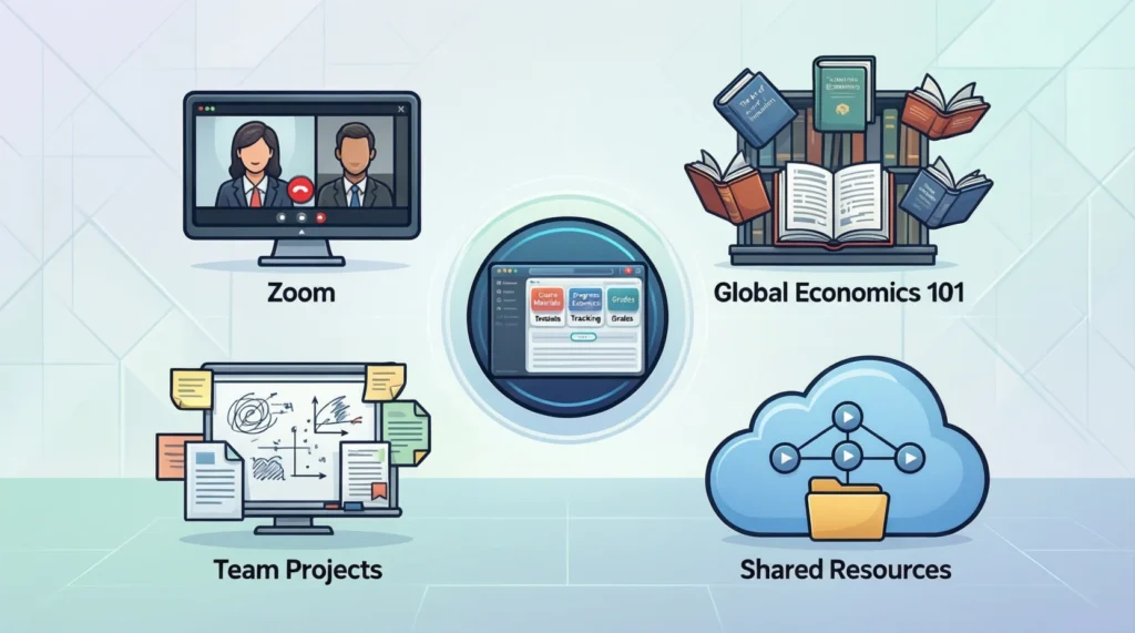 Higher education platforms emphasize research, collaboration, and accreditation. Students access academic databases, group tools, and career-focused learning resources.