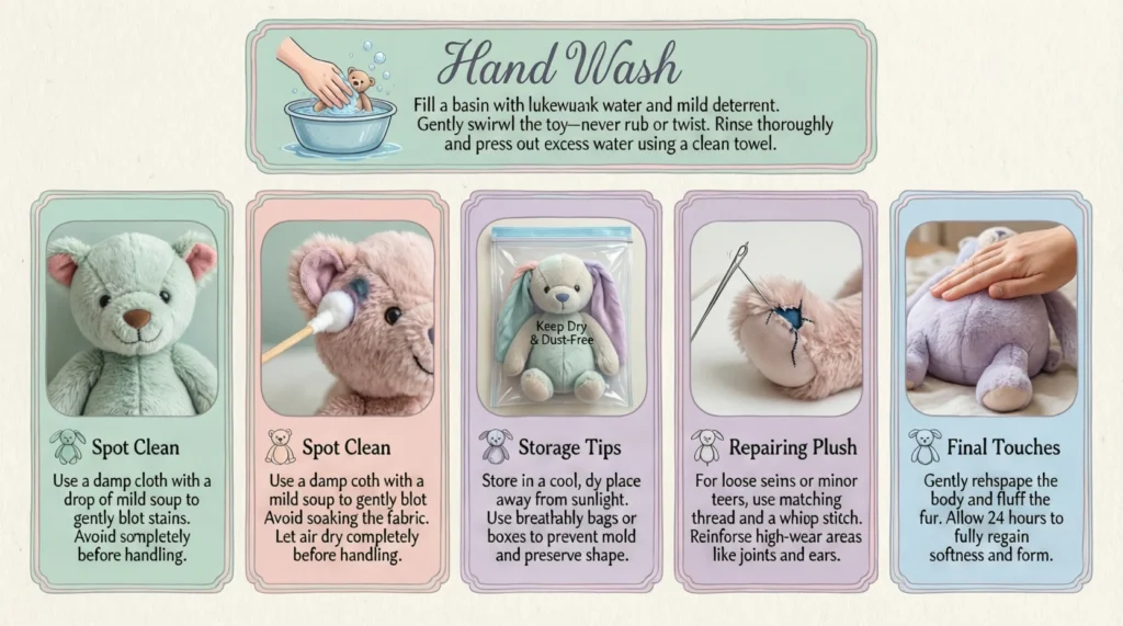 - Cleaning – Most plush can be hand-washed or spot-cleaned; some are machine washable on gentle cycles.