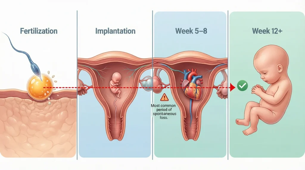 A miscarriage is the loss of a pregnancy before 20 weeks, most commonly in the first trimester (before 12 weeks). It usually happens because the pregnancy was not developing normally, often due to chromosomal issues that could not support life.