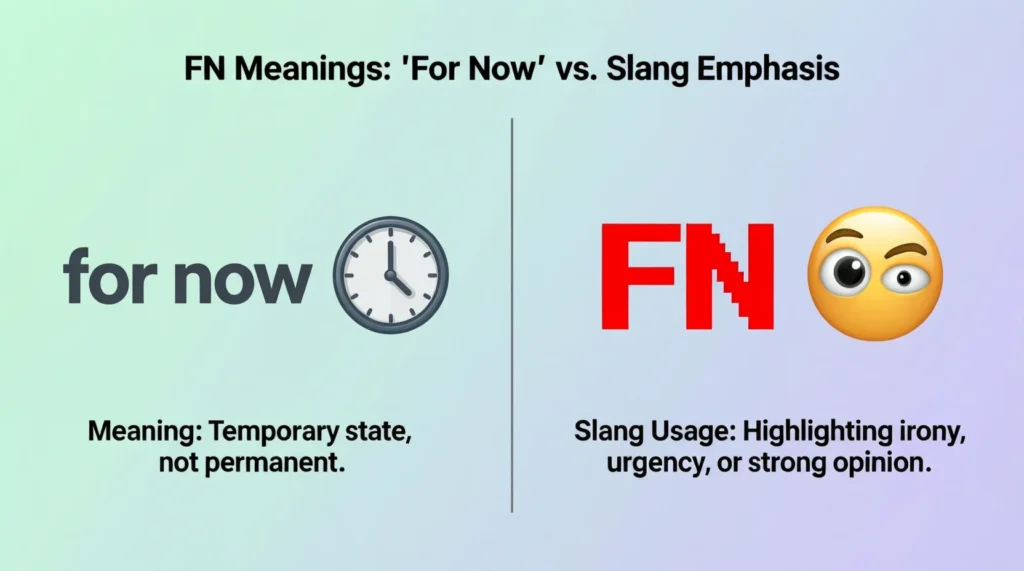 Bold summary: FN can mean “for now” or be slang for emphasis, and the meaning depends entirely on context.