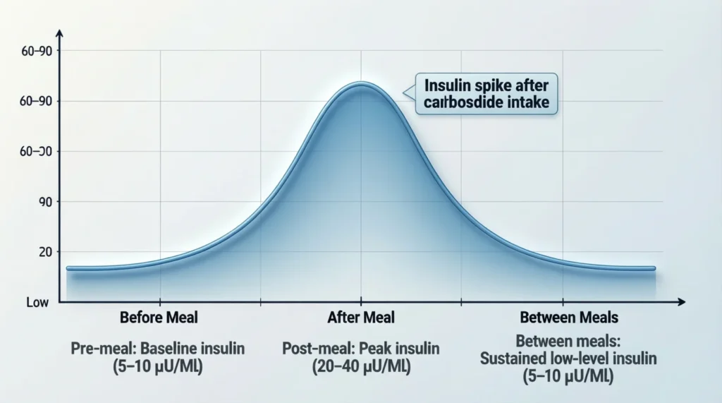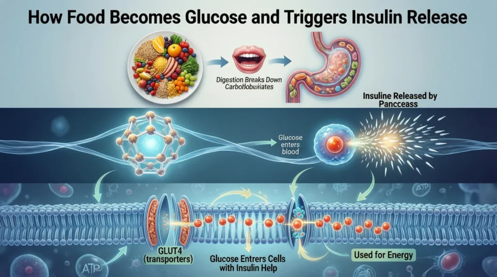 When you eat food, especially carbs like bread, rice, or fruit, your body breaks it down into glucose (a type of sugar). That sugar enters your bloodstream. Insulin’s job is to take that sugar out of the blood and push it into your cells, where it becomes energy.