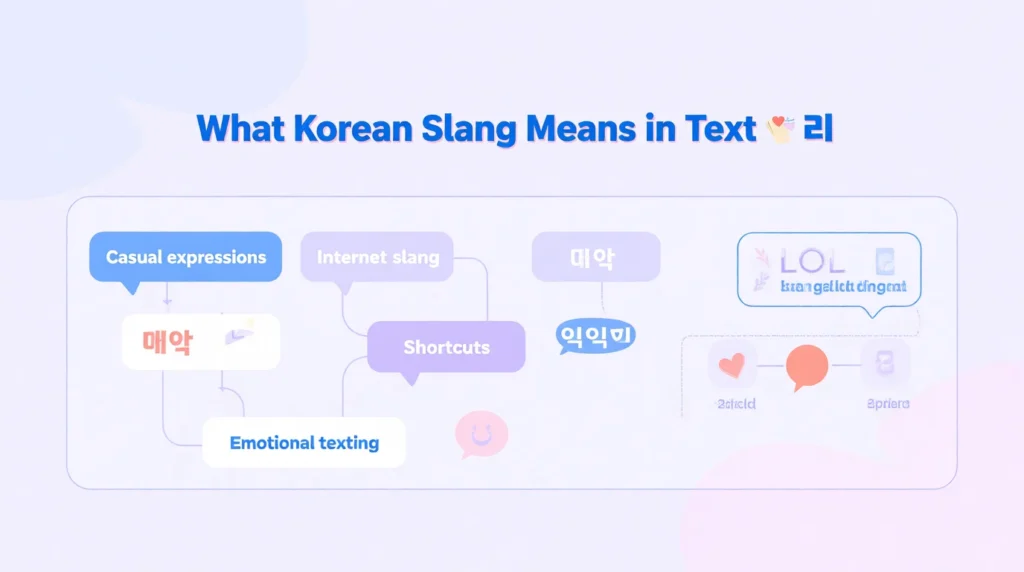 Korean slang includes shortened phrases, internet acronyms, sound-based expressions, and playful words commonly used in Korean online communities. These slang terms help people express emotions quickly, just like English slang such as “LOL” or “brb.”