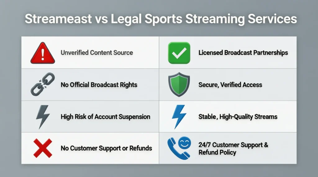 When comparing Streameast to licensed platforms, differences become clear. Paid services offer consistent quality, legal protection, and customer support. They also provide official apps and reliable schedules.